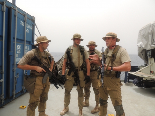 Apparentemente il basso profilo della Russia sembra volto ad evitare un’escalation che porterebbe ad un confronto su vasta scala. Di fatto, la prudenza potrebbe essere lo specchio di un’incapacità militare ad adottare efficaci misure di protezione ravvicinata dei mercantili riconducibili a propri interessi. Questa interpretazione sembrerebbe confermata dal fatto che su mercantili di bandiera sono stati imbarcate coppie di contractors armati (nella foto sopra guardie del  Moran Security Group) per la protezione.