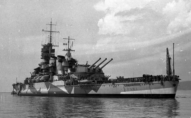 Dopo l’armistizio italiano alla corazzata Roma venne ordinato di raggiungere l’isola della Maddalena insieme ad altre unità militari. Il giorno dopo l’armistizio la squadra navale italiana venne attaccata da bombardieri tedeschi. La storia della corazzata Roma fu la più drammatica; colpita, poco dopo le 15.00, dovette fronteggiare una falla creata dalla bomba aerea che le attraversò lo scafo esplodendo sott’acqua.