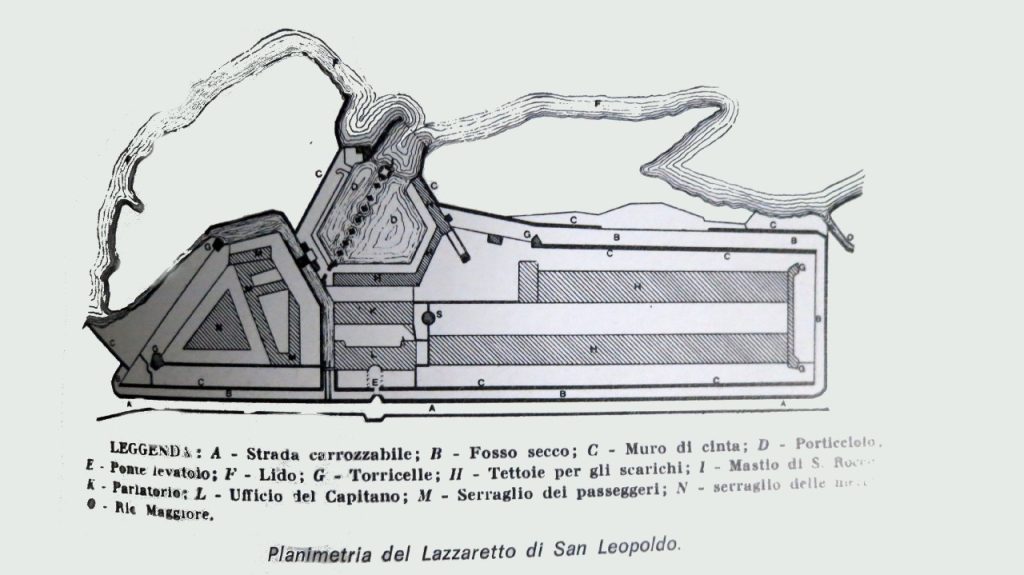 Sul grande portale monumentale d’ingresso, sopra l’arco si legge ancora la targa marmorea che commemora l’utilità dell’opera pubblica per la salute e la navigazione: “Petrus Leopuldus Arch. Austr. Hung. Boem. R.P. Magnus Etrur. Dux navigationis et salutis publicae vindex hominibus mercibusque graviore pestilentiae suspicione notatis tutius expurgandis remotiorem hanc insulam et porticus designavit construxit ann. MDCCLXXIII“.